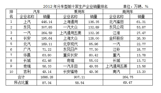 2012年分车型前十家生产企业销量排名 |